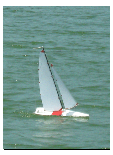 The photo was of grandson’s boat which was my first and a prototype. It was sailing before deck was attached and plastic tape used to reduce water splashing inside. Note bow position. Radio gear, and batteries are all clustered around the keel trunk. Moving battery pack forward of bulkhead and mast would bring the bow down if so desired.